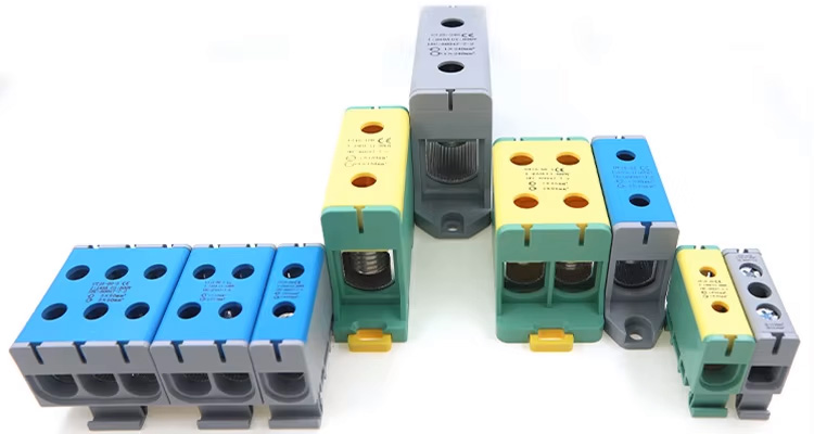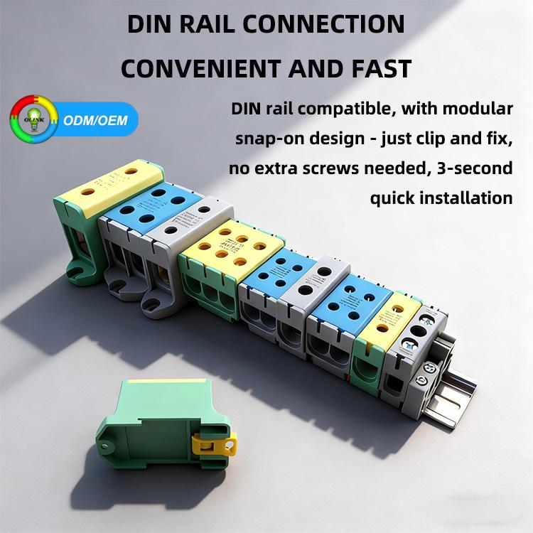Автомобильные клеммные колодки с винтовыми клеммами на DIN-рейку с заземляющим электрическим барьером постоянного тока 220 А — 3-слойные, многоконтактные, алюминиевые контакты
