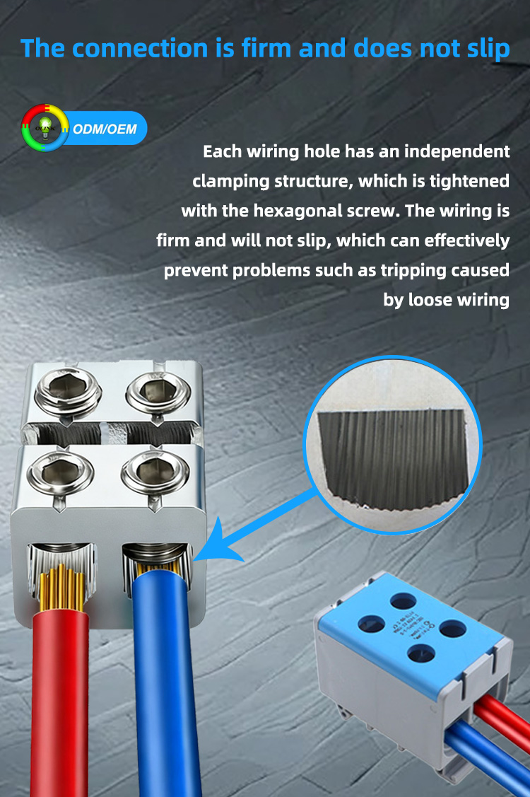 Утолщенные алюминиевые проводники отличаются лёгкостью, большим сечением и превосходной коррозионной стойкостью. Новый нейлон PA66 выдерживает высокие температуры и давление, сохраняя превосходные эксплуатационные характеристики в различных суровых условиях. Для подключения проводов с шестигранной головкой ослабьте винты перед подключением и затяните их после. Это гарантирует надёжное и долговечное соединение.