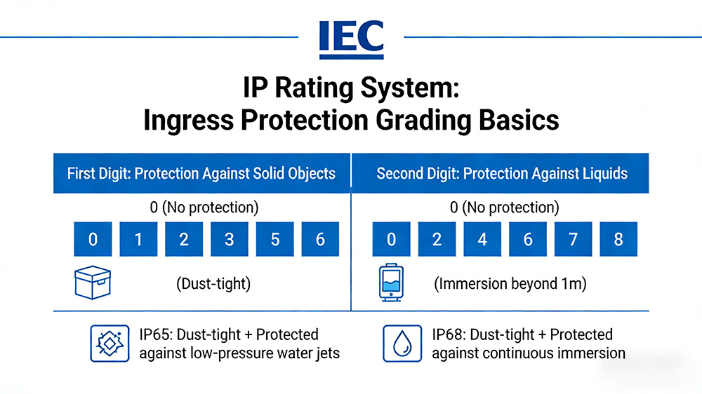 IP (Ingress Protection) ratings quantify a device’s resistance to solid particles and liquid intrusion, established by international standards bodies such as the IEC (International Electrotechnical Commission). This standardized rating system enables buyers to select components engineered for long-term reliability in real-world operating conditions.